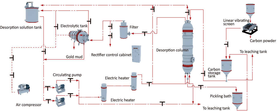 Gold loaded carbon is changed into gold mud and lean carbon in desorption electrolysis system.